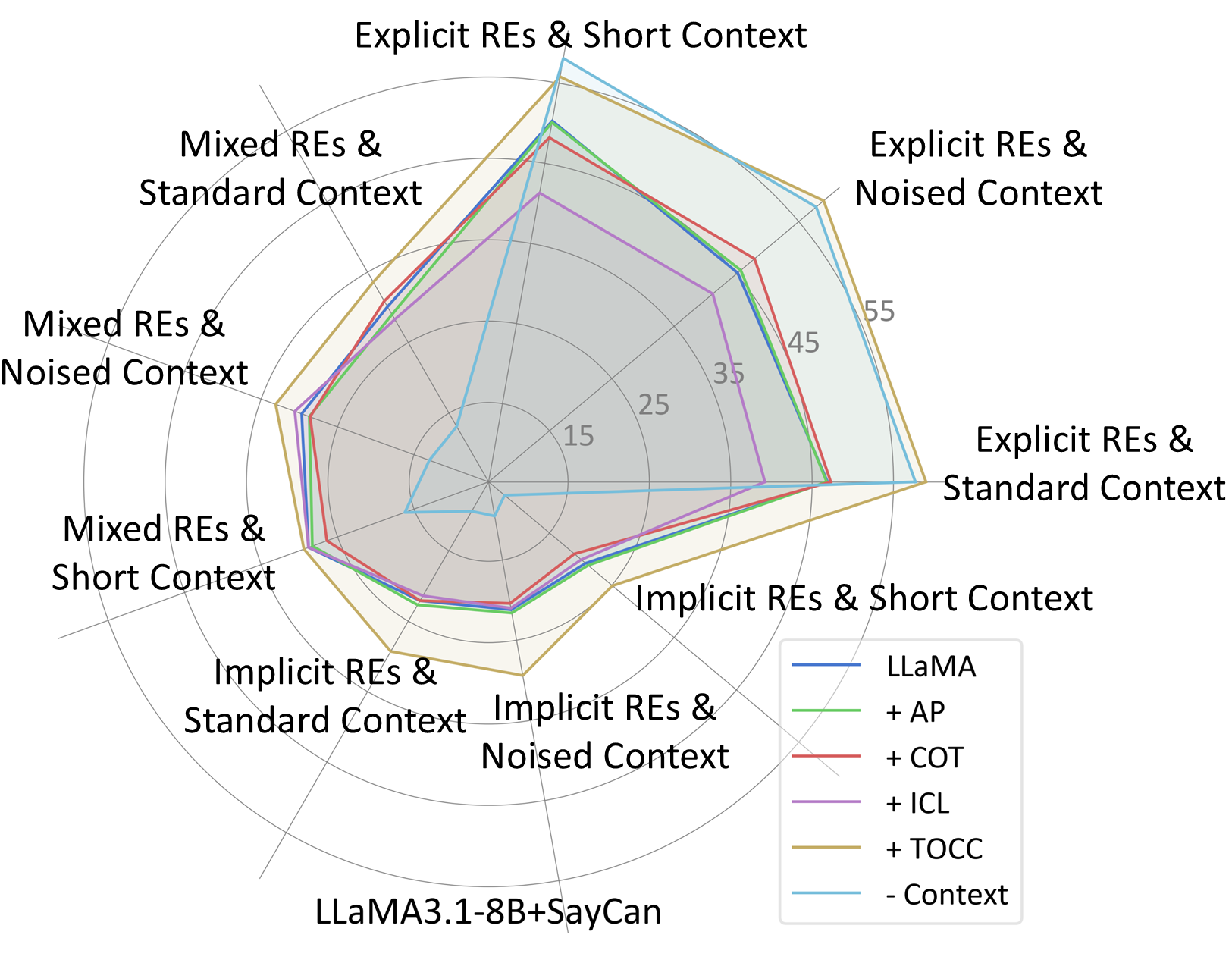 We evaluate three conventional prompting methods to alleviate coreferential vagueness in robot planning: aware prompt (AP), Chain-of-Thought (CoT), and In-Context Learning (ICL). However, AP remains insufficient as it fails to induce the deep reasoning required for implicit REs, while both CoT and ICL substantially lengthen prompts, hindering performance on resource-constrained onboard hardware. To this end, we propose a simple yet effective method, task-oriented context cognition (TOCC), which decouples RE resolution from the planning process by prompting the planner to resolve implicit REs and rephrase instructions into a concise form before planning.